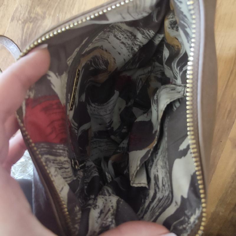 сумка в ідеальному стані, підклад і замки цілі, єдиний недолік це потертості у куточках, фото додала. ширина сумки 26 см, висота 22 см.
