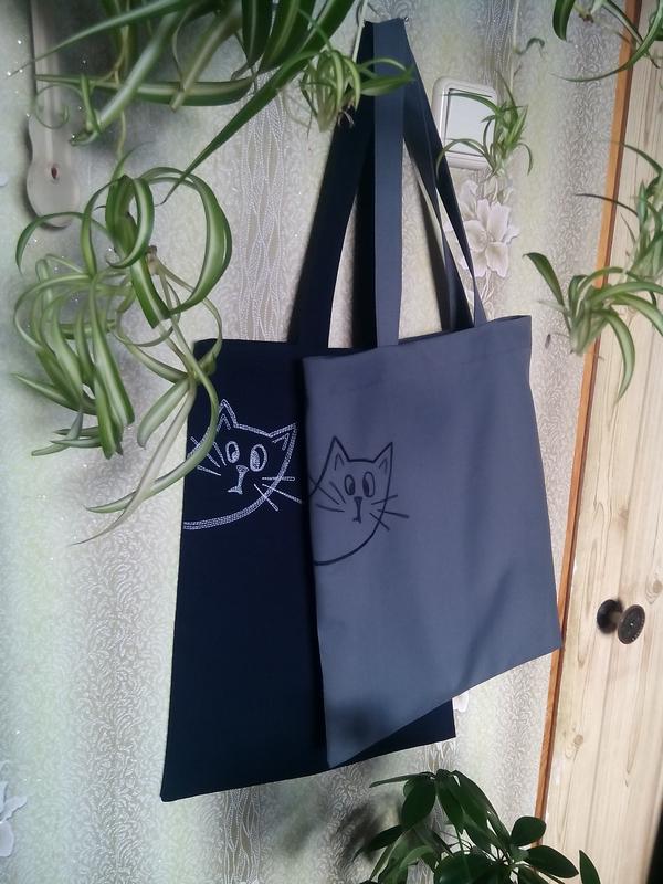 В наявності 4 торбинки: 2 чорні та 2 сірі. Котик лише один на сірому. Можливо, будуть ще з вишивкою, але зараз хворію, нічого не можу робити.