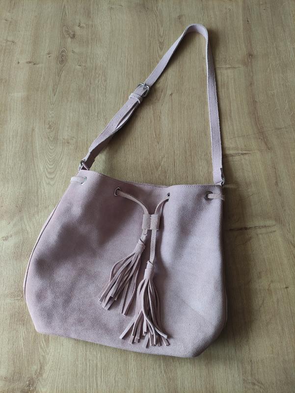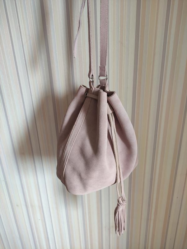 жіноча шкіряна замшева сумка, Німеччина На стяжці. Натуральна шкіра. Висота сумки — 28 см. Розміри дна — 24х11 см. Ідеальний стан, жодних нюансів.