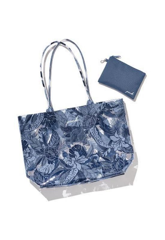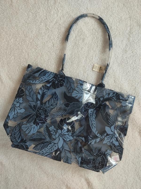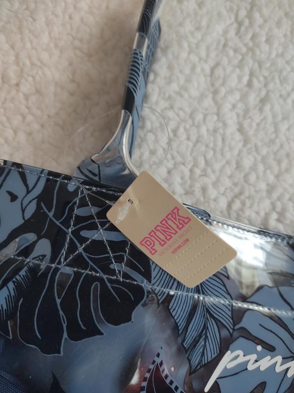 Прозрачная сумка Victorias Secret PINK украшенная эффектным растительным принтом, без застежки. Внутри небольшая косметичка для мелочей, пристегнутая карабином к сумке.