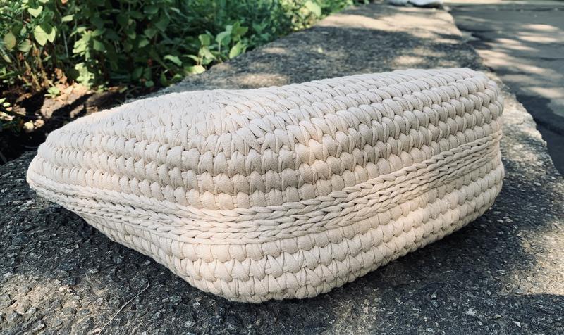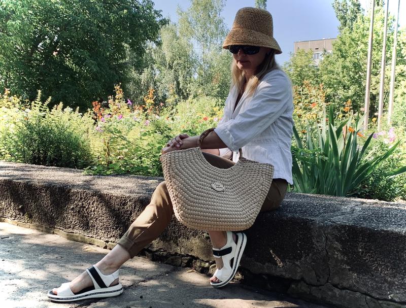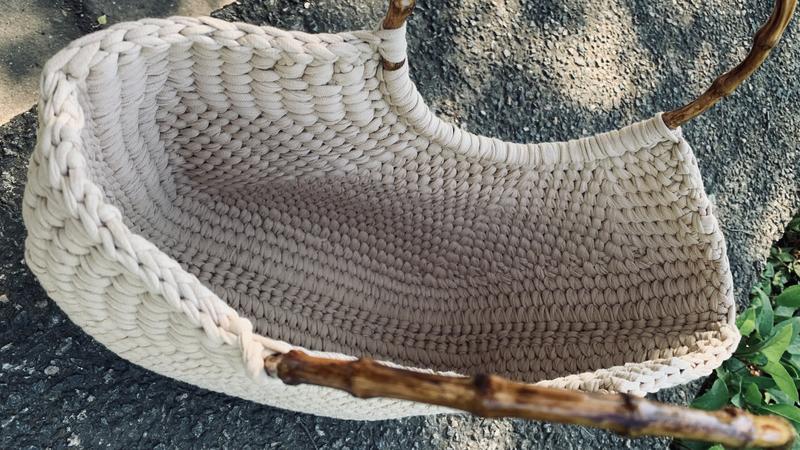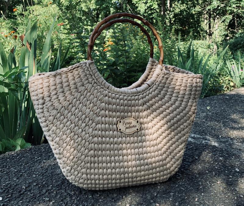 Виготовлена з трикотажної пряжі українського виробництва. Ручки з пластмаси під «бамбук»Кольори в асортименті. Ручна робота.
