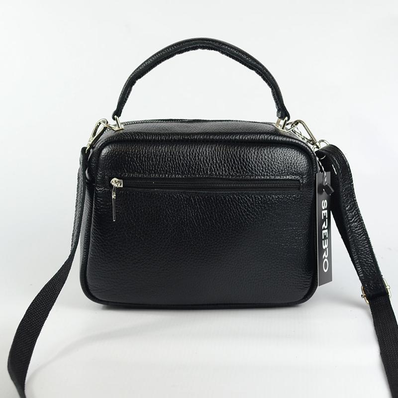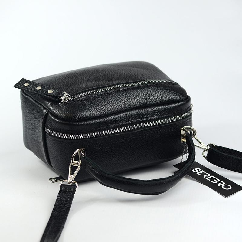 Модель з довгим шкіряним ремінцем. Шкіра натуральна, колір чорний, білий, бордовий. Срібляста блискуча фурнітура. Одне відділення на блискавці. Розмір: 23x17x10 см. Ремінець довгий 120 см максимальна довжина. На лицьовій частині кишеня на блискавці, на задній стінці кишеня на блискавці, всередині дві відкриті маленькі кишені. Стильний барвисті модні аксесуари через плече на блискавці.