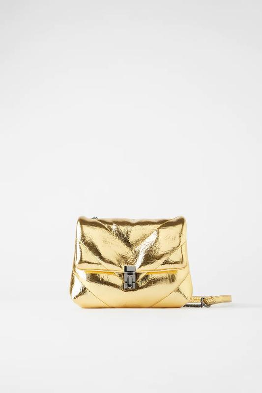 золотиста стьобана міні-торба з клапаном. Плечовий ремінь із ланцюжком. Підкладка із кишенею, металева застібка.