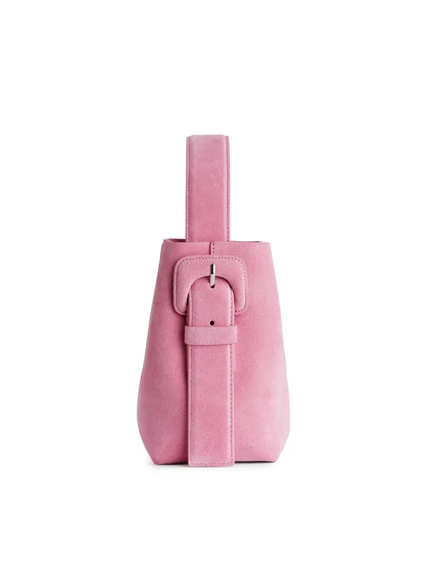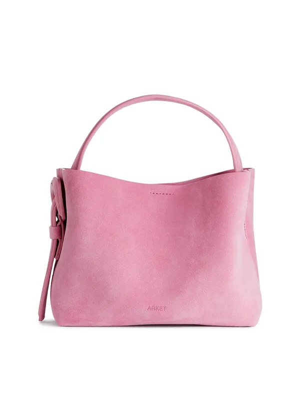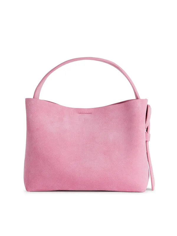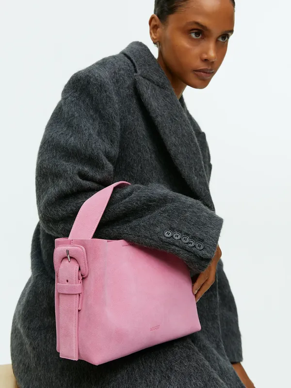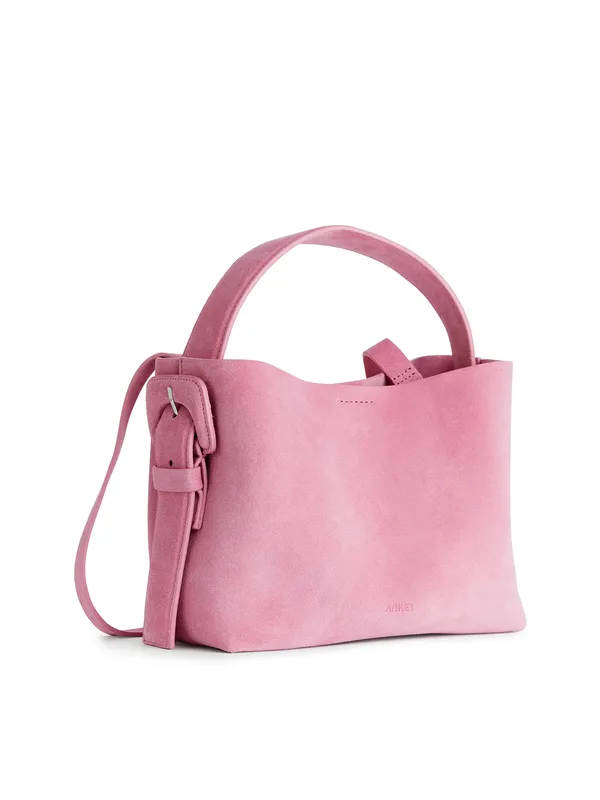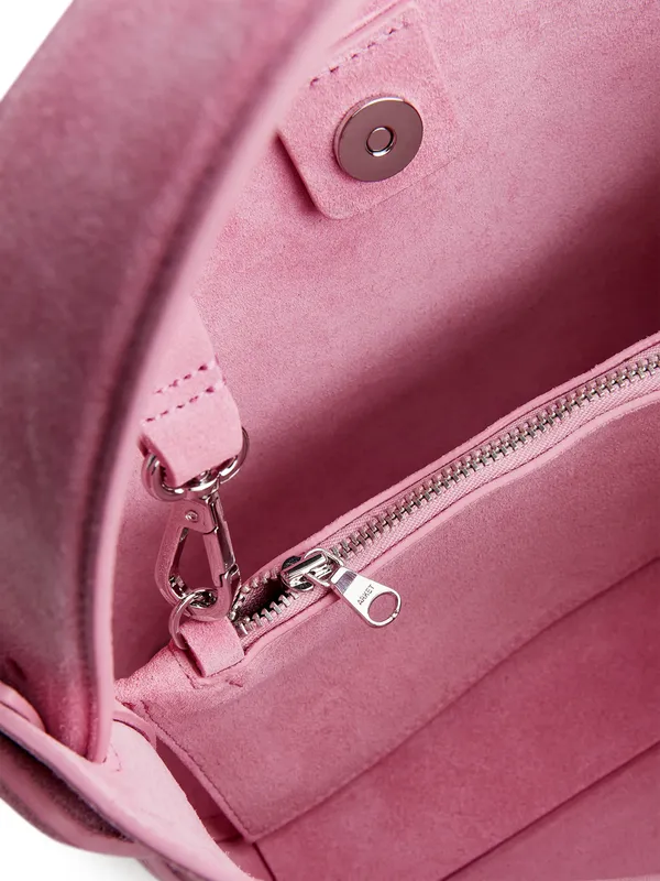 Сумка через плече середнього розміру із замші. Деталізована магнітною застібкою та широкою верхньою ручкою з пряжкою, покритою замшею. Плечовий ремінь і верхня ручка регулюються по довжині. Сумка містить середнє відділення, яке закривається на блискавку.