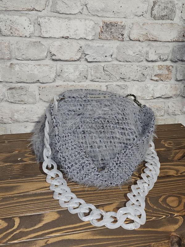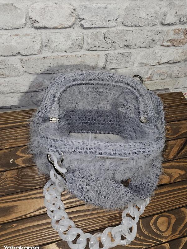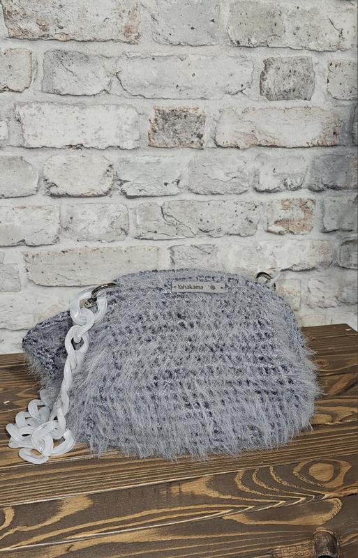 Пухнаста сумочка ручної роботи - клатч на короткій в'язаній ручці - виготовлена з м'якої пряжі. Вона має прямокутну форму та досить компактний розмір, щоб помістити в неї необхідні речі, такі як гаманець, мобільний телефон та косметику.