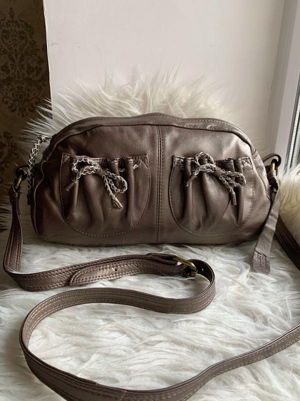 Компактна шкіряна сумочка 16,5х31см, дно 12см, ремень 119см (регулюється). Спереді два карманчика, основний відділ на застібкі, в середині є також карманчики. Стан сумочки ідеальний. Гарний і стильний дизайн, сумку можна носити в руках, на/через плече.