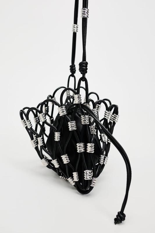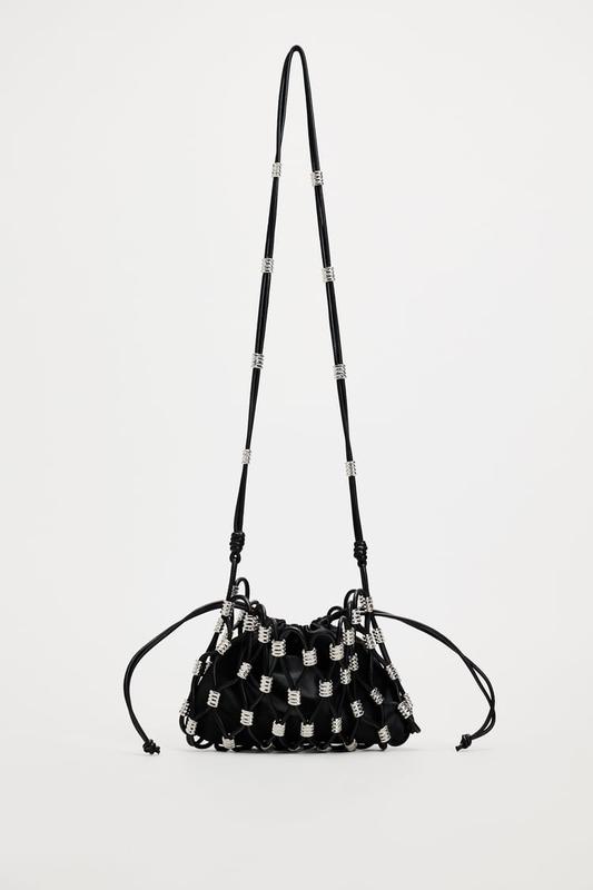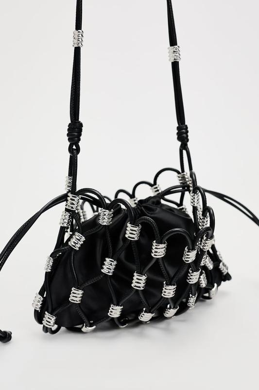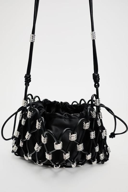 Сумка-мішок із металевими кільцями. Має ремінець через плече та застібається шляхом затягування шнурків.