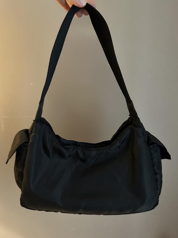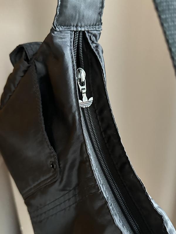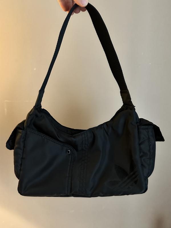 Чорна маленька сумочка з зовнішньою відкритою кишенею та боковими кишенями на липучках. В середині є відділення та додаткова кишеня на застібці. На зовнішньому боці сумочки логотип Adidas Original, який дещо витерся, видно на фото. Всі застібки працюють добре.