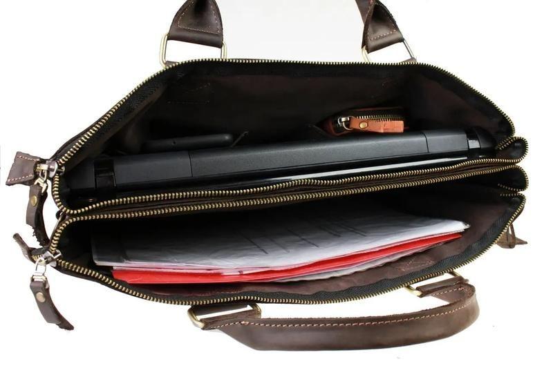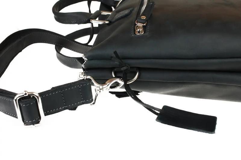 Шкіряні ручки, регульований плечовий ремінь обшитий шкірою. Шкіряні перегородки.