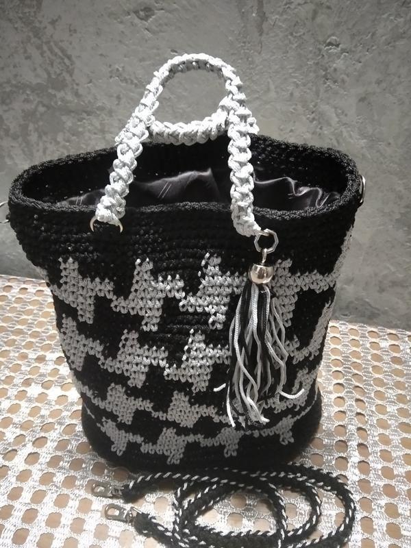 Сумочка ручної роботи.Має ручки і ремінь який знімається.Розмір середній.Виготовлена з шнура макраме в стилі жаккарду.