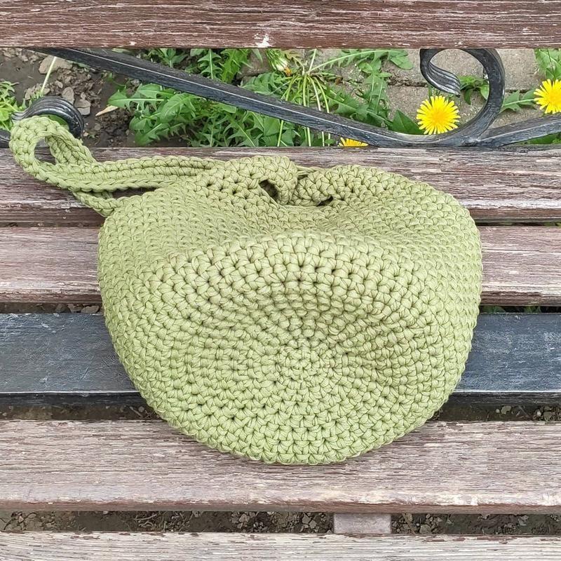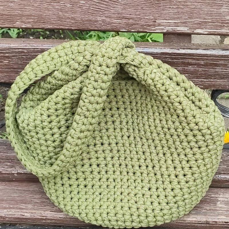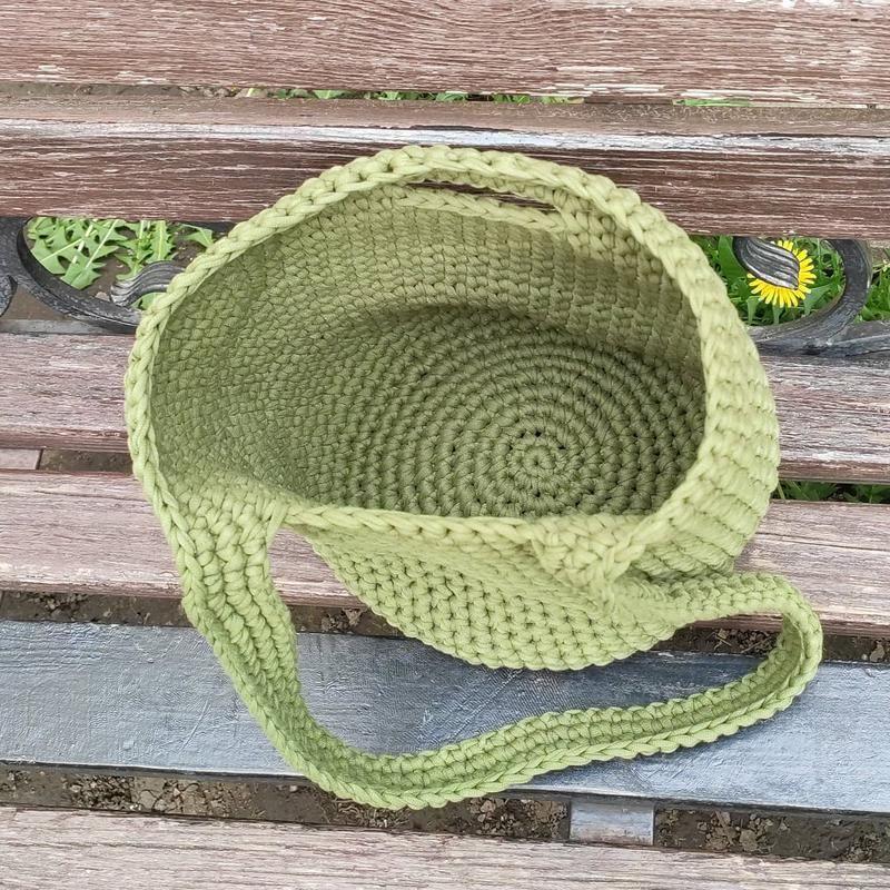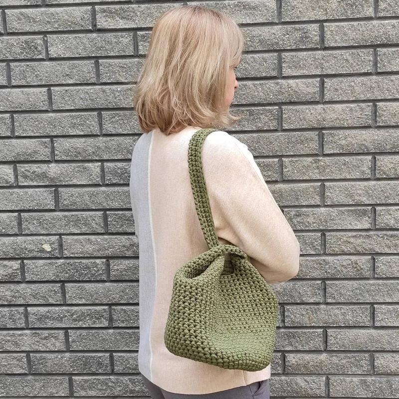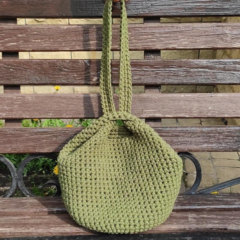 Сумка-петля, японська сумка, сумка-мішок - назв у неї багато, називайте, як подобається🙂 Вона все одно залишиться зручною, легкою та актуальною. Зв'язана з трикотажної пряжі, колір хакі. Розміри: висота без ручок 26 см, з ручками 56 см, ширина по одній стороні верху 30 см, діаметр денця 20 см. Вага 350 грам. Сумка без підкладки.