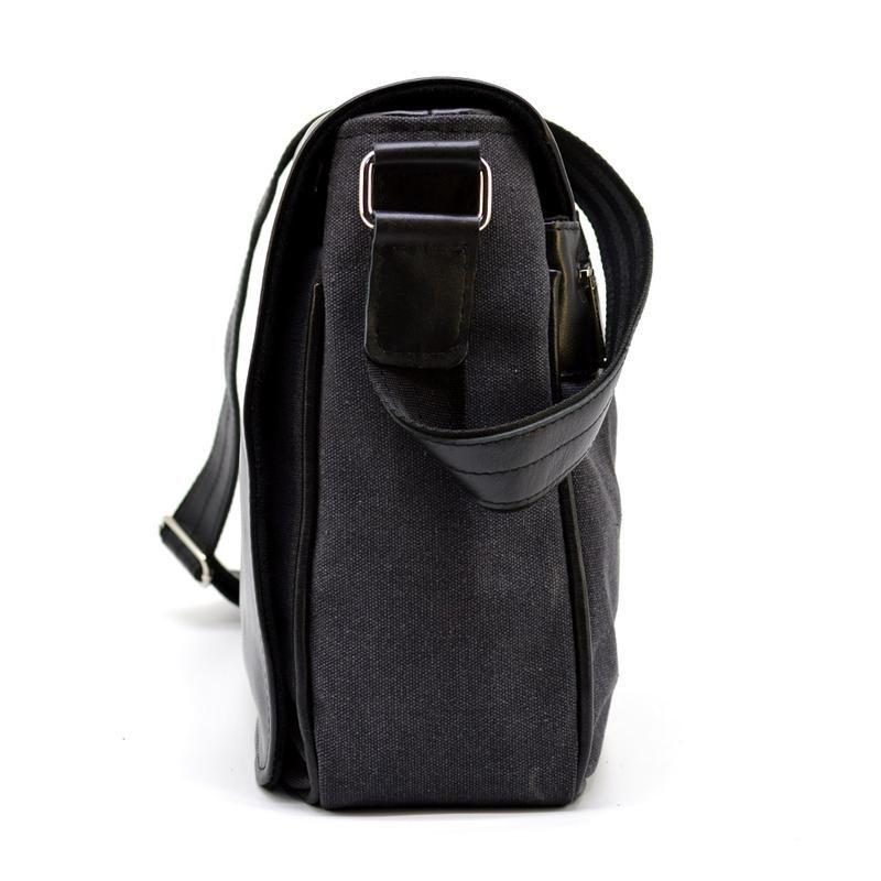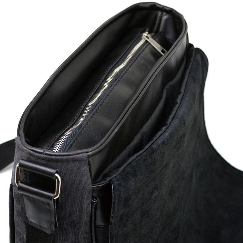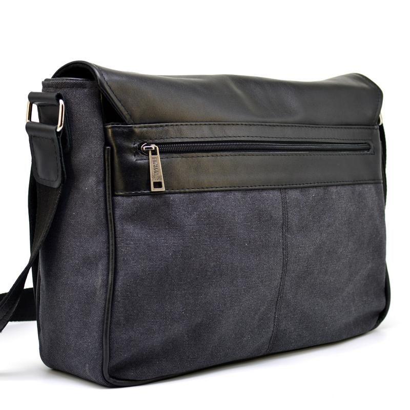 Мужская сумка через плечо микс натуральной кожи и холщевой ткани канвас TARWA GG-1047-3md. Вмещает формат А4 и ноутбук до 14" в основном отделении. Изделие на одно вместительное отделение, с мягким отсеком внутри для планшета с хлястиком и липучкой, также внутри имеются три кармана: один вместительный врезной на молнии и два открытых для портмоне и телефона. Снаружи на лицевой стороне под клапаном есть большой плоский врезной карман с молнией. Снаружи на задней стороне - также врезной карман на молнии. Сама сумка застібається на блискавку, а зверху накривається великим шкіряним клапаном, та безпосередньо у цій моделі виробники вирішили зробити клапан довше ніж основна частина сумки. Широкий регульований наплічний ремінь зі шкіри, дозволяє комфортно носити аксесуар на плечі. Характеристики Бренд TARWA Колір виробу Сіро-чорна Розміри сумки 37 × 27 × 11 Сорт шкіри Тканина+шкіра Країна походження Україна