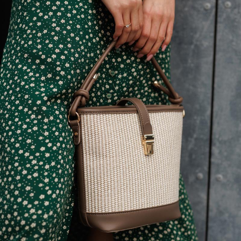 Сумка бежева кошик текстиль екошкіра коричнева 589397