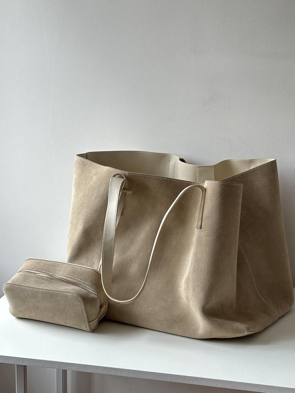 Шопер з натуральної замші, виготовлений на замовлення, в комплекті косметичка, прикріплена до ручки ( знімається), без підкладу, замша важка, тримає форму В носці була один раз Стан 5+ В пильнику 35*45*31см