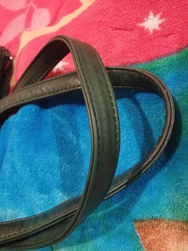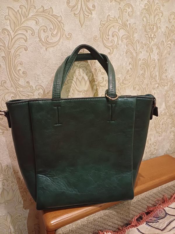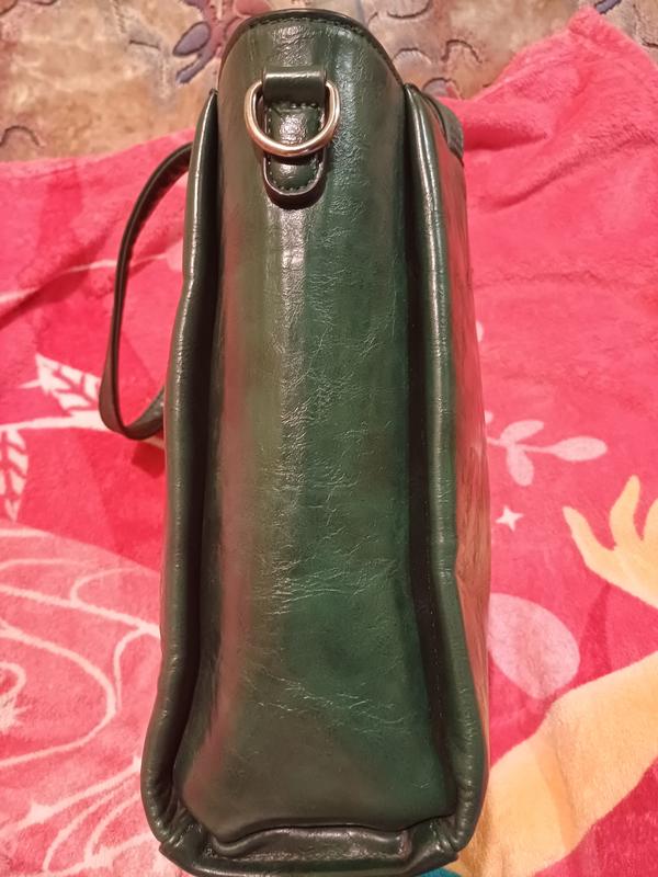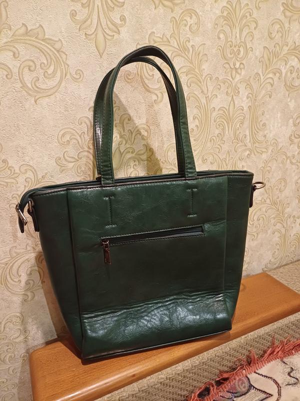 Велика жіноча сумка темно зеленого кольору, б/в, в дуже хорошому стані.Висота -28 см, довжина -35 см, ширина -12 см. Всередині підкладка має три відділення,середній карманчик підкладки на молнії, бокові карманчики, один на молнії.