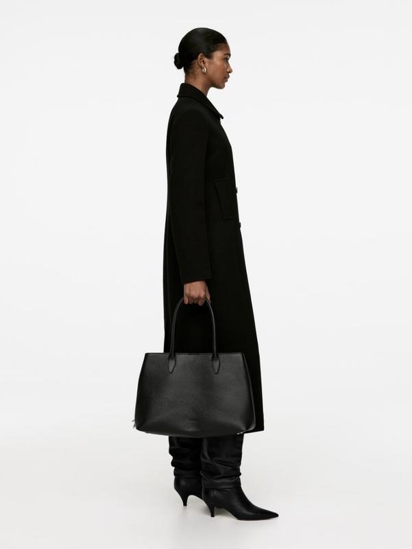 Шкіряна сумка з трьома відділеннями: центральне відділення на блискавці та два відділення на магнітній застібці. Можна носити в руці або через плече за допомогою ручок. Позолочені ніжки та внутрішня кишеня на блискавці. Остання колекція ! Висота 28 см, ширина 40 см, глибина 15 см.