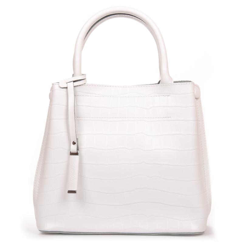 Виготовлена з натуральної щільної шкіри. Три відділення: центральне закривається на блискавку, а бічні на магнітну кнопку. Усередині центрального відділення є бокова кишеня на блискавці і відкритий подвійний кишеню. Жорстке дно на металевих ніжках. У комплекті регульований плечовий ремінь. Розмір (см.) 26 * 23 * 12, висота ручок 10см.