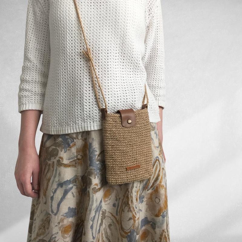В'язана сумка-чохол(холдер) для телефону, ручна робота, колір соломяний - в'язана з натурального джуту. Зручний варіант, поміщається телефон, гаманець, ключі та серветки - найнеобхідніші жіночі дрібниці. Сумочка закривається на кнопку міні-клапаном з натуральної шкіри. Підклад - поліестер. Ремінець із крученого джутового шнура. Розмір 18×12.5×1.5см, ремінець - 120см регульований В наявності Чудовий подарунок в стилі бохо)