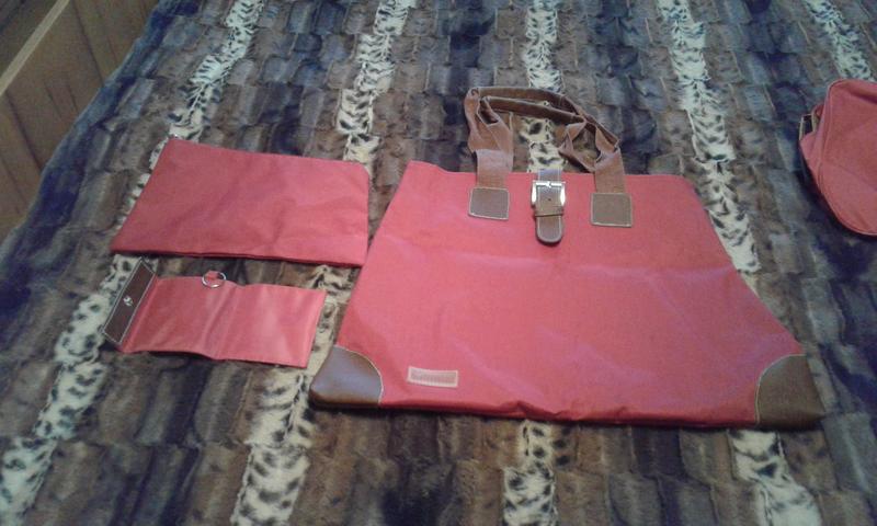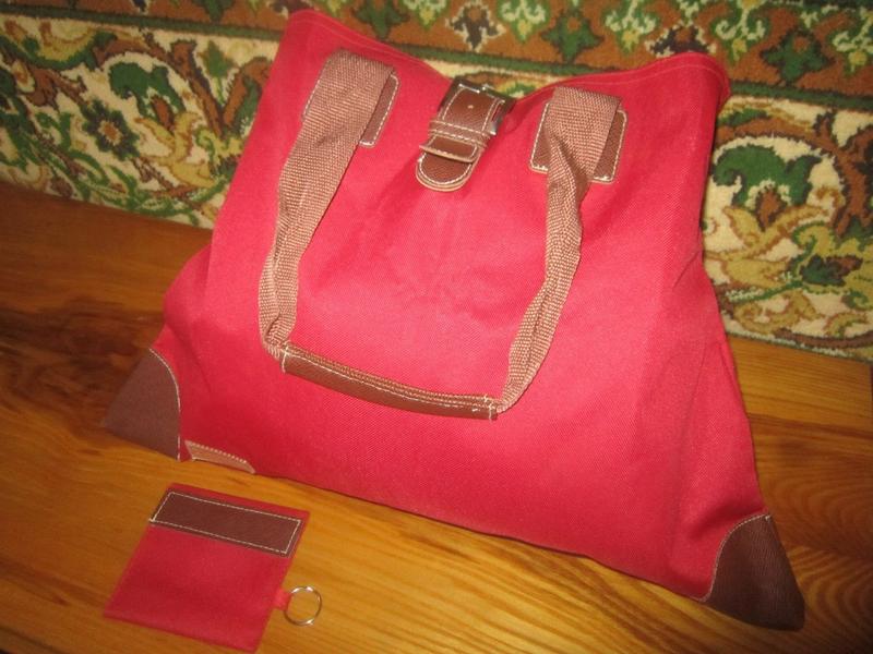 Пляжна Сумка - дорожня з ключницею та косметичкою. Довжина внизу 50 мі. Вгорі 36 см, висота 35 див. Косметичка 29х16 см, ключниця з кишенькою для карток , застібка на кнопці. У сумки застібка кнопка - під ремінь з пряжкою