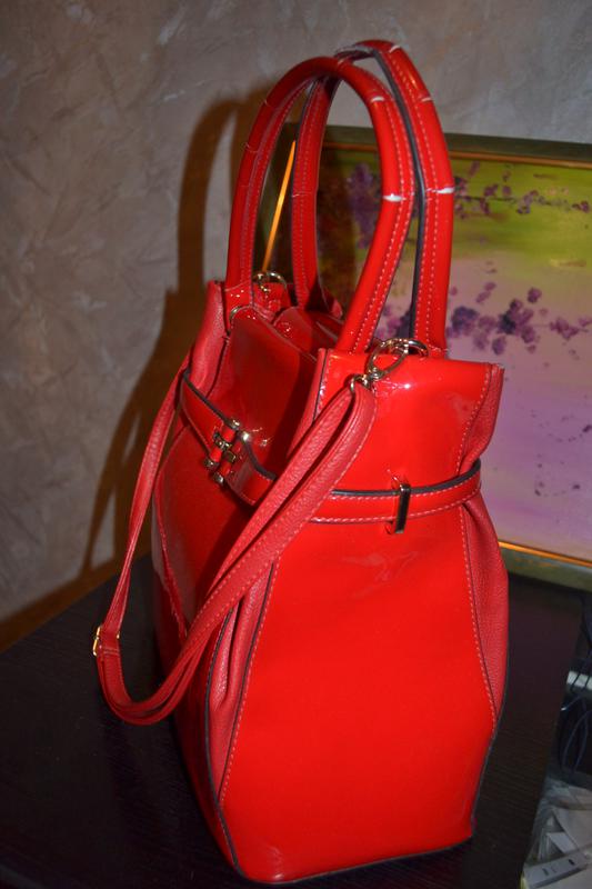 ІТАЛІЙСЬКА лакова СУМКА яскраво-червона з короткими і довгою ручкою. Довга ручка і 4 невеликих трикутника з боків сумки комбіновані з матовою червоною шкірою. Аксесуари в золотому виконанні. Дуже гламурна. Шикарно виглядає . Знаходиться в ідеальному стані(як зовні, так і всередині), Буде прикрашати вас ще довго,крім двох лакових коротких ручок, які трохи потріскалися. Однак їх можна замінити на матові , які можна скроїти з довжиною матовою ручки "через плече"