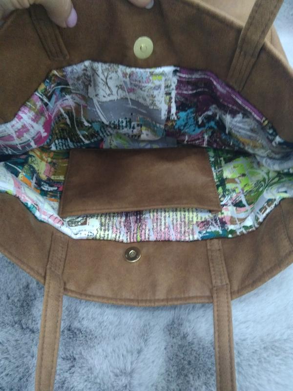 Сумка шопер ручна робота. Тканина з тефлоновим покриттям, дуже схожа на шкіру, на екошкіру, в шкарпетці веде себе відмінно. Розміри ширина 40см, висота 38см, висота з ручками 60см, висота ручок 23см, глибина 12см. Всередині є кишеня, сумка на підкладці.