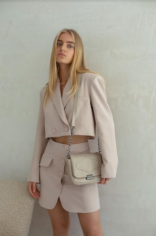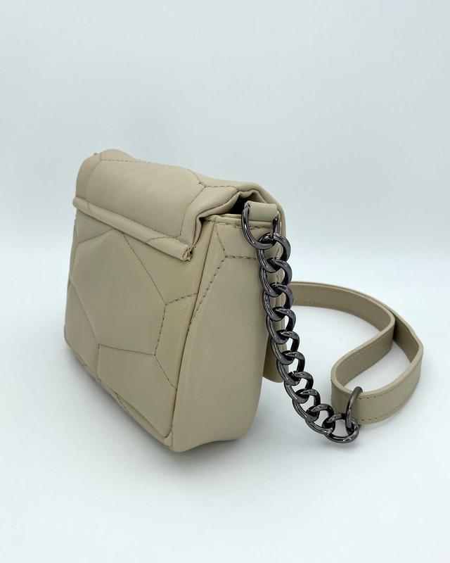 Сумка открывается при помощи замка и молнии. Внутри сумка на плотной подкладке. Вшитая посередине косметичка делит сумку на две части. Также внутри имеет открытый карман. Ручка сумки украшена цепочкой. Замок сумки открывается нажатием на кнопку сбоку под крышкой. Плечевой ремень украшен цепочкой, регулируется под разную длину, максимальная длина 135 см.