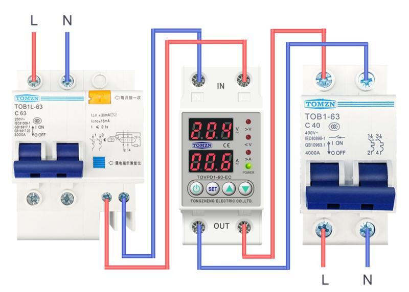 Реле напруги Tomzn TOVPD1-60-EC захищає електроприлади від високої і низької напруги шляхом їх відключення від електричної мережі. Також в реле є функція захисту по струму - при перевищенні заданого порогу по струму реле також відключає навантаження від мережі. Має два цифрових індикатори для відображення струму, напруги, затримки перед влюченням. Також є світлодіодні індикатори які інформують про спрацювання по перевищенню напруги по верхній і по нижній межі, перевищення по струму і про нормальну роботу реле.