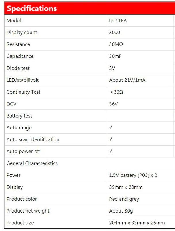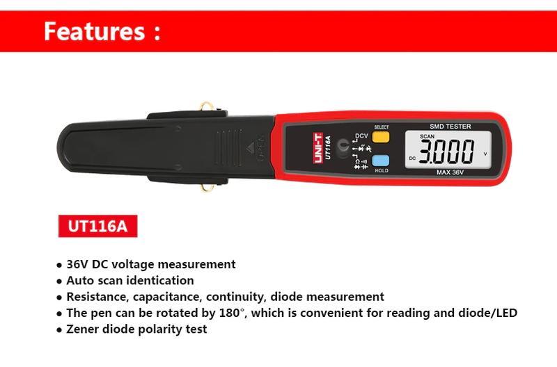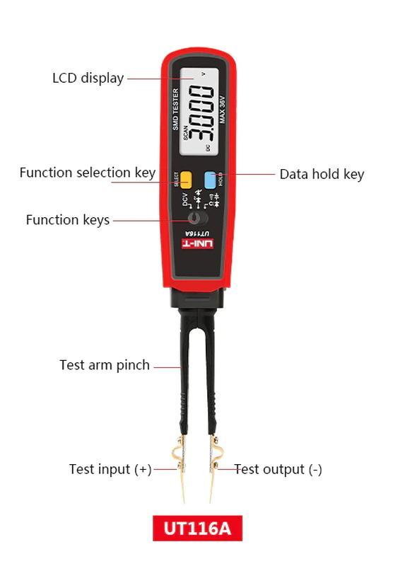 Миниатюрный тестер-пинцет UT116C, производства UNI-T, позволяет измерять напряжение постоянного тока, сопротивление, емкость, производить прозвонку цепей, проверку стабилитронов и светодиодов.