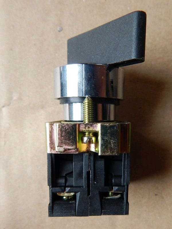 Двопозиційний перемикач LAY5-BJ25 містить контакти 1з+1р (або 1NO і 1NC), які змінюють положення при зміні положення рукоятки.