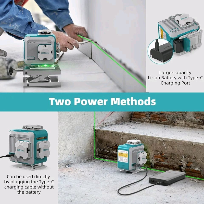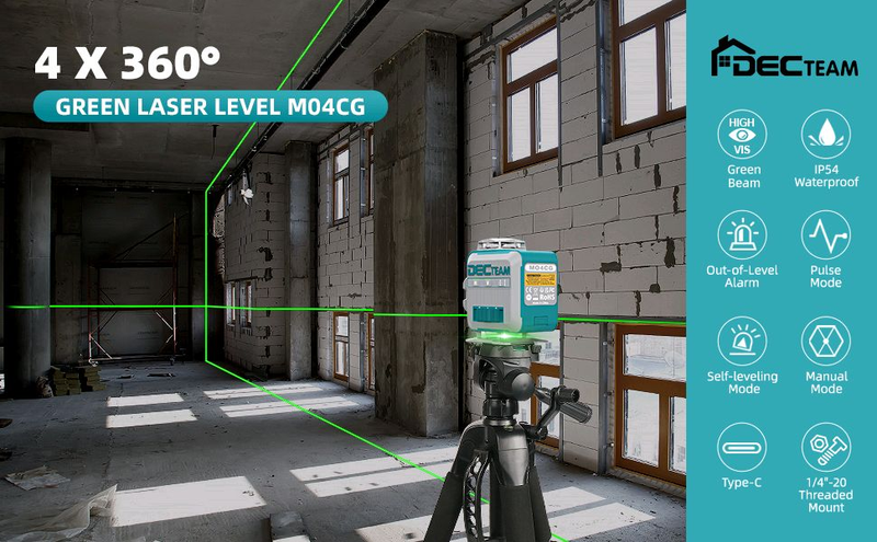 Компактный профессиональный лазерный уровень DecTeam M04CG - лазерный нивелир (построитель плоскостей) с четырьмя лазерными диодами, которые образуют четыре взаимно перпендикулярных лазерных плоскости 360° (две вертикальные и две горизонтальных). Башни металлические. Продуманый режим переключения плоскостей. Есть функция работы с заблокированным маятником под углом. Работает от Li-ion аккумулятора 7.4V 2600Ah (в комплекте). Также имеется порт Type-C для работы от павербанка/блока питания