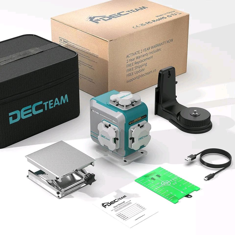DecTeam M04СG лазерный нивелир зеленый луч изготовлен в соответствии с самыми жесткими требованиями американского рынка, предлагает всем потребителям полную 2-х годичную гантию.