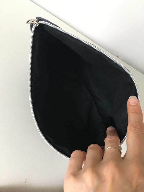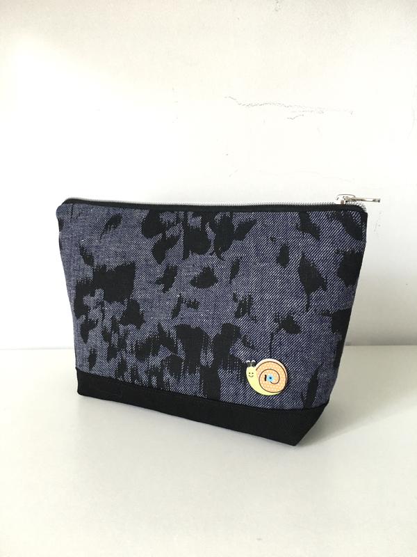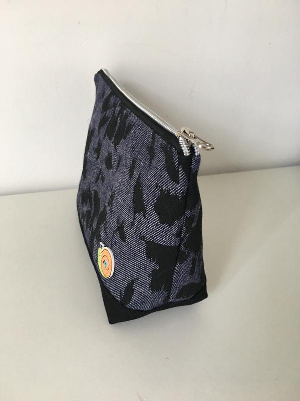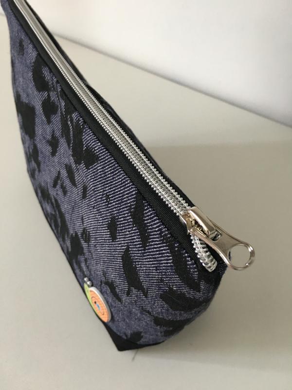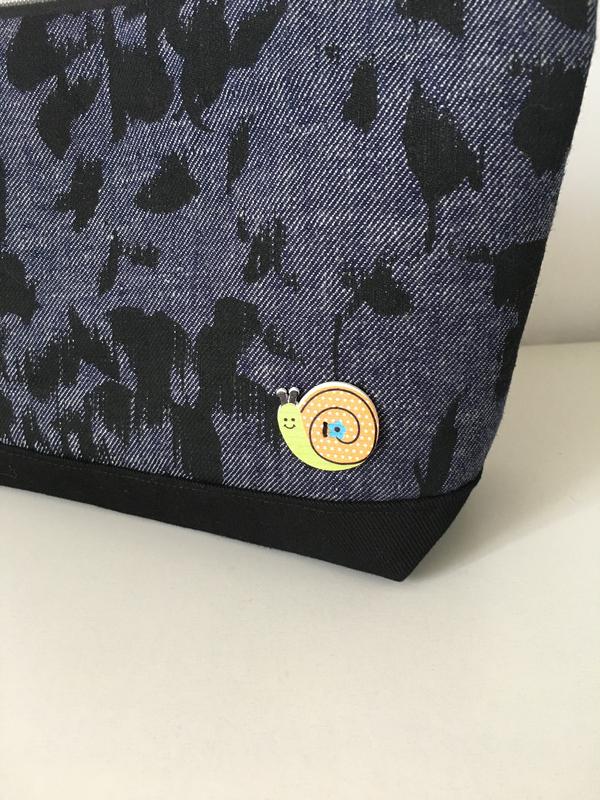 Косметичка в темних кольорах з яскравим акцентом - маленьким равликом.Розміри 27х17 смУщільнена, не м‘яка.Широке дноСрібна блискавкаВ середині підкладка