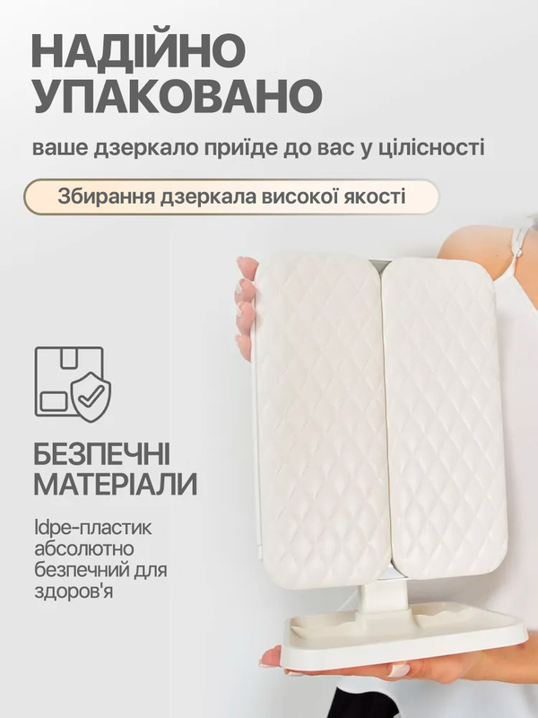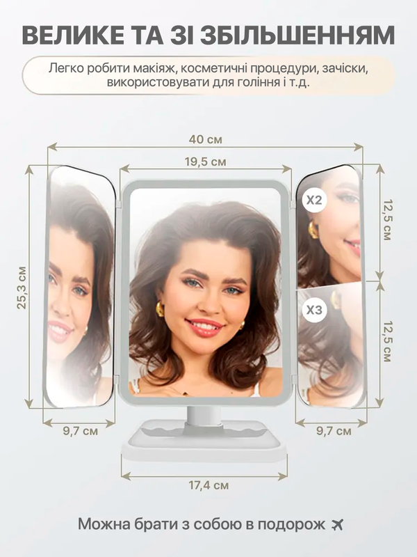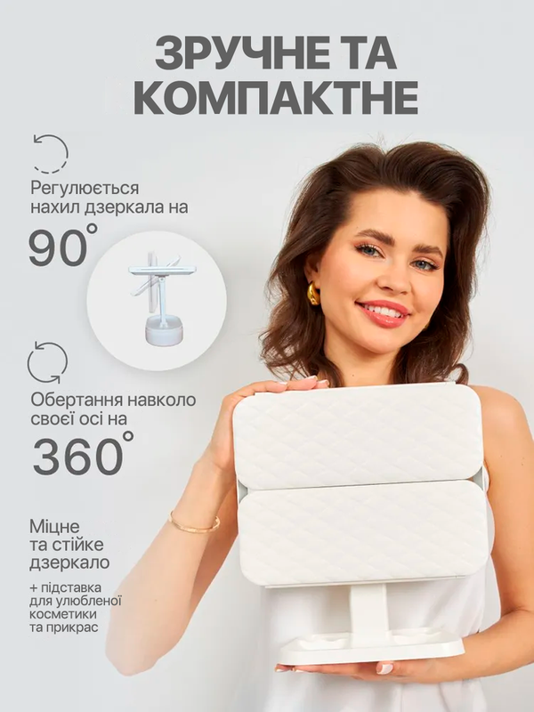 Це дзеркало стане незамінним помічником як вдома так і у подорожах.Завдяки своїй портативності та можливості складатися воно легко поміститися у рюкзаку або валізі.