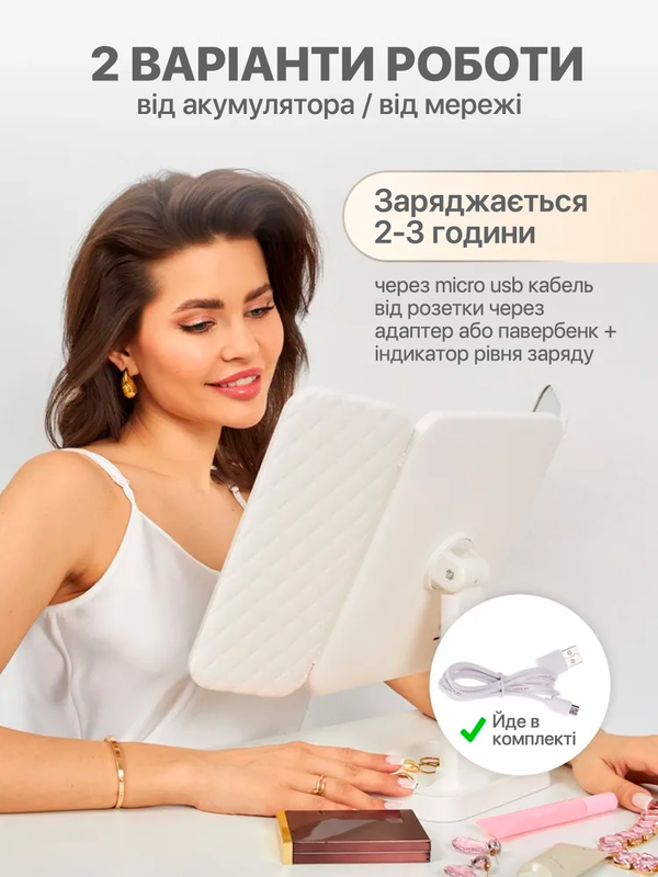 Дзеркало настільне косметичне представляє собою невід'ємний аксесуар кожної дівчини. Завдяки LED подсвідці дзеркало забезпечуєрівномірне освіщення обличчя з усіх боків,що дозволяє наносити макіяж у будь-який час доби.