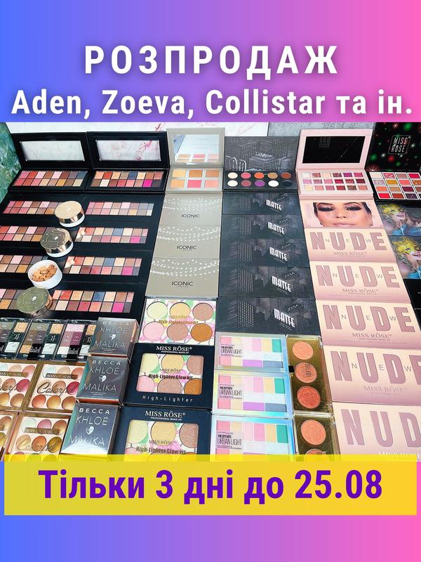 Розпродаж косметики від 345 грн! 2019-2020 р випуску, сток з Італії, оригінал, докладний опис дивіться у моїх товарах. Або пишіть, що зацікавило - скину посилання на товар! В наявності буде ТІЛЬКИ до 24.08, цієї неділі всі залишки забирають! Щодо термінів не питайте! Я ЇХ НЕ ЗНАЮ! майже ніде не вказано, вся косметика зберігається у закритих коробках Палетки тіней: Aden Cosmetics Eyeshadow Palette Nude та Smoky - по 650 грн Zoeva Matte Eyeshadow Palette - 750 грн New NUDE Miss Rose - 465 грн Miss Rose Eyeshadow Palette - 465 грн Miss Rose Highlighter Glow Kit - 395 грн Maybelline New York City City Kits Urban Light - 345 грн Iman Of Noble Colorful 01 та 02 - по 345 грн NYC Individual Eyes 948 Blue Eyes Basics - 345 грн Моделююча палетка скульптор Iconic London - 695 грн Рум'яна та хайлайтер Sephora - по 380 грн Триколірні рум'яни Clara Paris - 345 грн Рум'яна Collistar 3 відтінки - по 500 грн Рум'яна Wycon Quick Blush - 420 грн Золотий хайлайтер Becca x Khloe Kardashian & Malika Haqq - 695 грн Сріблястий хайлайтер Louvre Maquillage - 395 грн Рум'яна Mikyajy 22K 3D cheek palette 901 - 550 грн Пудра Douglas Ultimate Powder Foundation 4 відтінку - по 500 грн Матова пудра Kiko Milano відтінки 02 та 07 - по 465 грн Фіксуюча розсипчаста пудра Artdeco Fixing Powder - 475 грн Праймер стік Kiko Milano Face Primer Base Visage 9,5 g - 350 грн Також є помади МАС (тестери, відтінки не підписані), Clarins, Bobbi Brown, Diego Dalla Palma, Teviant Haute Rossorossetto (від 395 грн) Тональні Liz Earle, Erre Due, Evagarden, Italpharma, Alcina, Yolo та ін. (від 395 грн) ВАЖЛИВО! Багато товарів приходять без коробок, тому можуть мати потертості та подряпини. Якщо вам це важливо (наприклад, купуєте для подарунка) - уточнюйте все ДО покупки і читайте уважно опис!