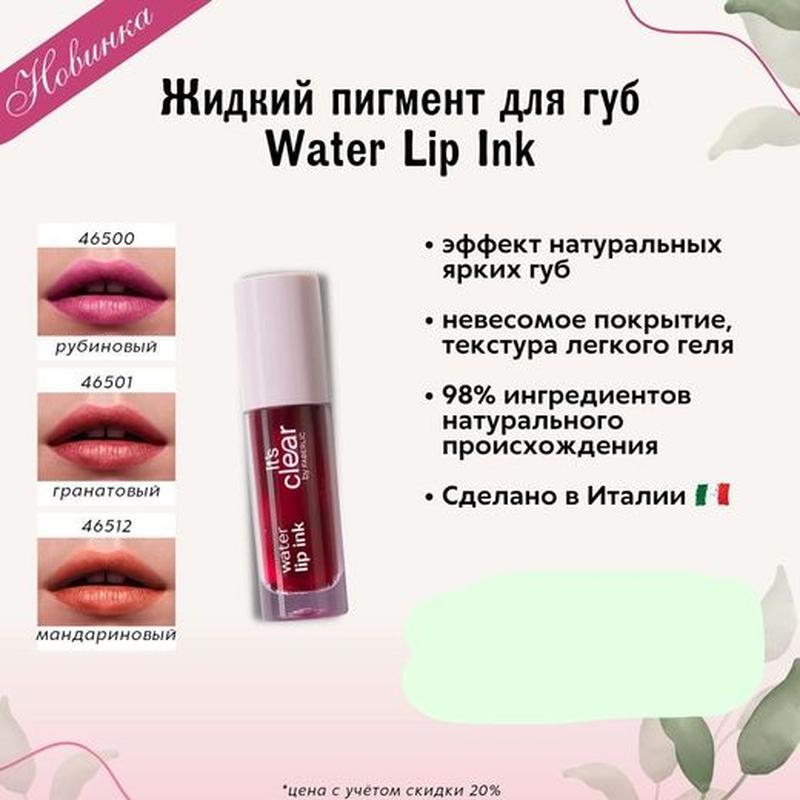 Жидкий пигмент для губ Water Lip Ink сочетает свежесть и увлажнение воды и стойкость тинта, создает коже second skin effect. Невесомое покрытие, текстура легкого геля, эффект натуральных ярких губ. Как будто вы только что поели ягоды.