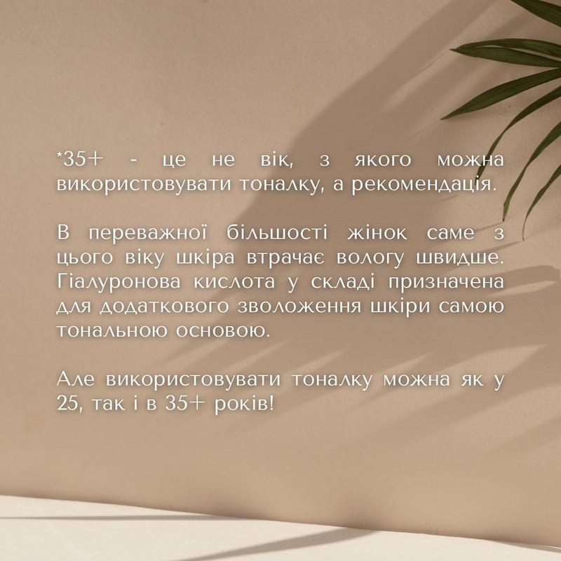 Завдяки силіконовим часткам, всередині яких міститься пудра, тональний крем «MAKE-UP 35+» рівномірно розподіляється по всій поверхні шкіри, не накопичуючись всередині мімічних зморшок, приховуючи дрібні недоліки. Крім того, тональний крем пристосовується до кольору особи і не закупорює пори, дозволяючи шкірі дихати. Міцна силіконова сіточка у складі крему забезпечує його стійкість на шкірі протягом тривалого часу, зберігаючи колір. Міститься в тональному кремі мікроскопічна окис титану захищає шкіру від шкідливих променів UVB і UVA. C учетом вышесказанного, вот наши главные причины пользоваться тональным средством: