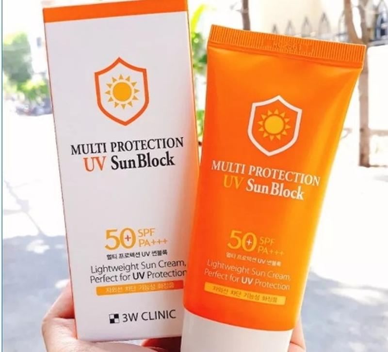 3W Clinic Multi Protection UV Sun Block SPF50+/PA+++ — сонцезахисний крем допомагає захистити шкіру від негативного впливу ультрафіолетових променів, збагатити її корисними мікроелементами та поліпшити загальний стан.