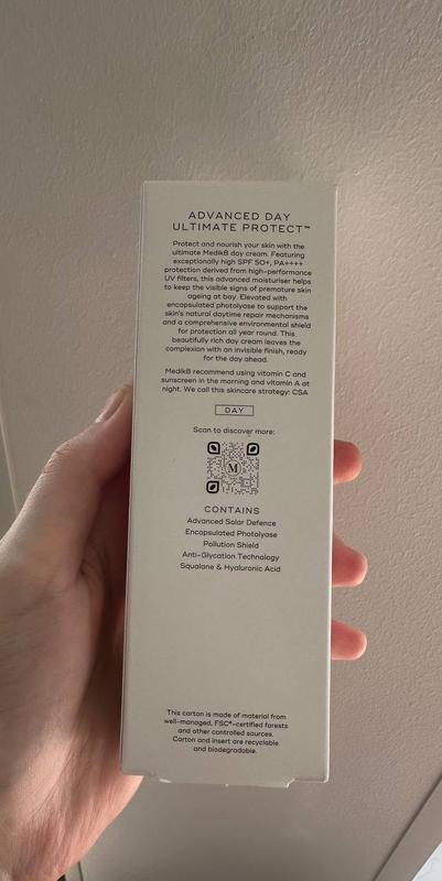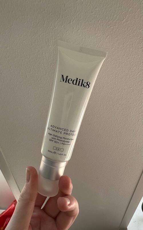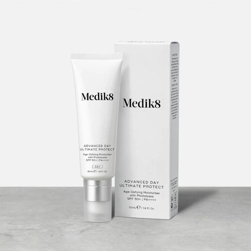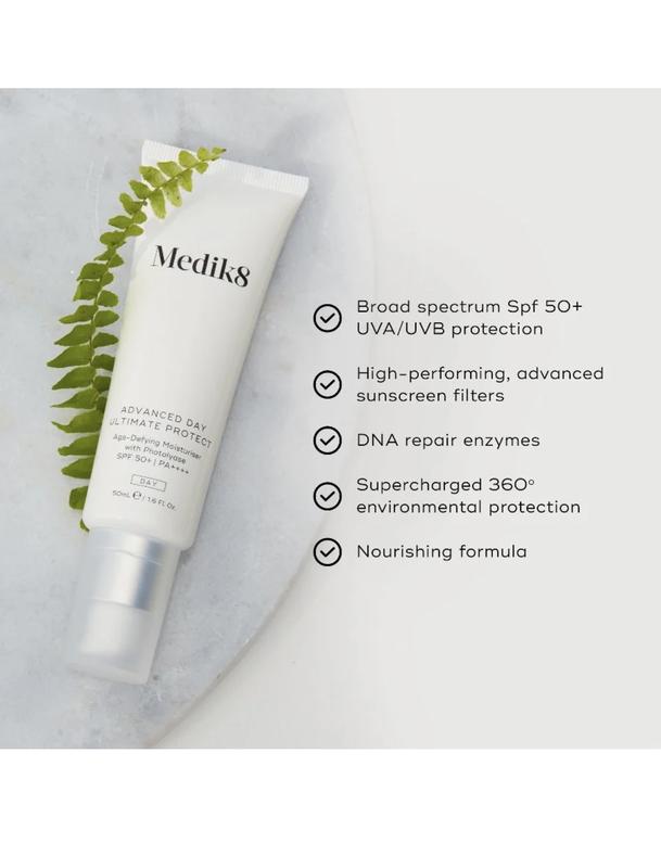 Найідеальніший денний крем від Medik8 Advanced Day Ultimate Protect поєднує в собі високий рівень захисту SPF 50+ та PA++++, а також містить інноваційні ензими репарації ДНК та потужний комплексний екологічний щит. Розкішний зволожуючий крем утворює над шкірою невидимий захисний щит та забезпечує надійний захист кожного дня. Формула допоможе запобігти появі перших ознак старіння, мінімізує наслідки фотоушкодження, помітно розгладжує лінії та зморшки, при цьому гарантує довготривалу гідратацію та потужний захист від ультрафіолету.