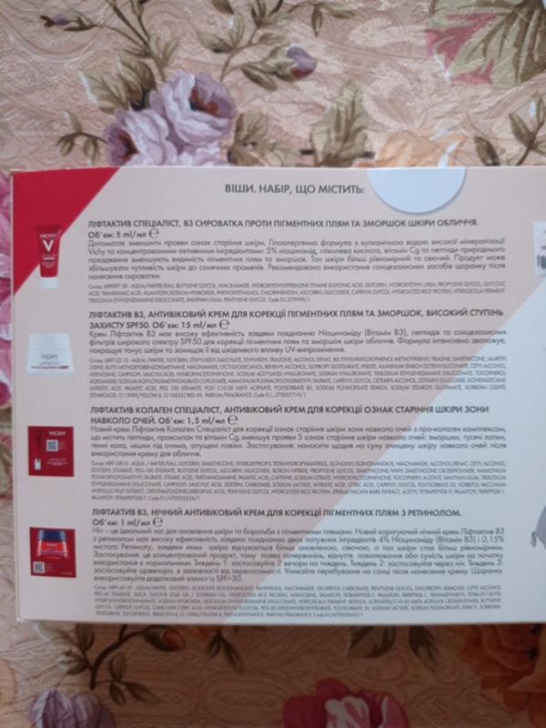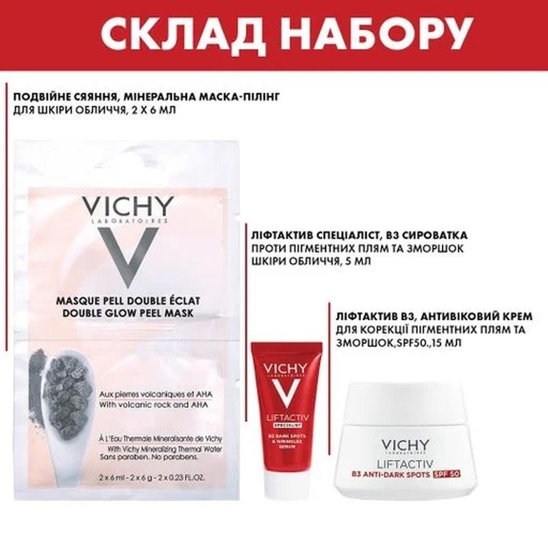 Сироватка Liftactiv Specialist B3, 5 мл. Продукт має гіпоалергенну формулу з ніацинамідом, гліколевою кислотою та вітаміном Сg, завдяки якій зменшує видимість пігментних плям і зморшок, покращує тон і текстуру шкіри.