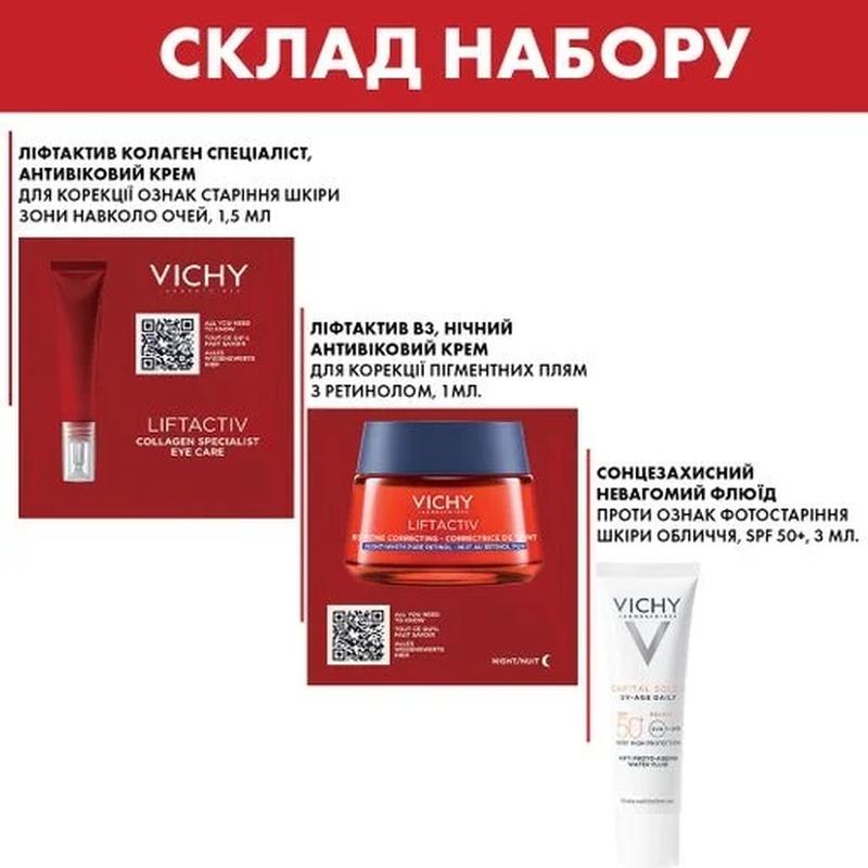 Антивіковий крем Liftactiv В3, 15 мл. Крем з ніацинамідом, пептидами та SPF 50 ефективно коригує пігментні плями і зморшки, захищає шкіру від UV-випромінювання.