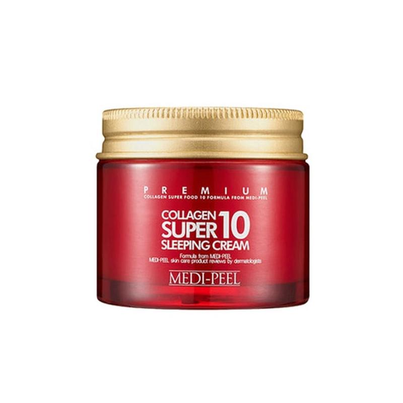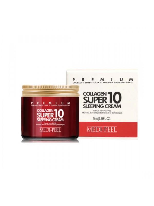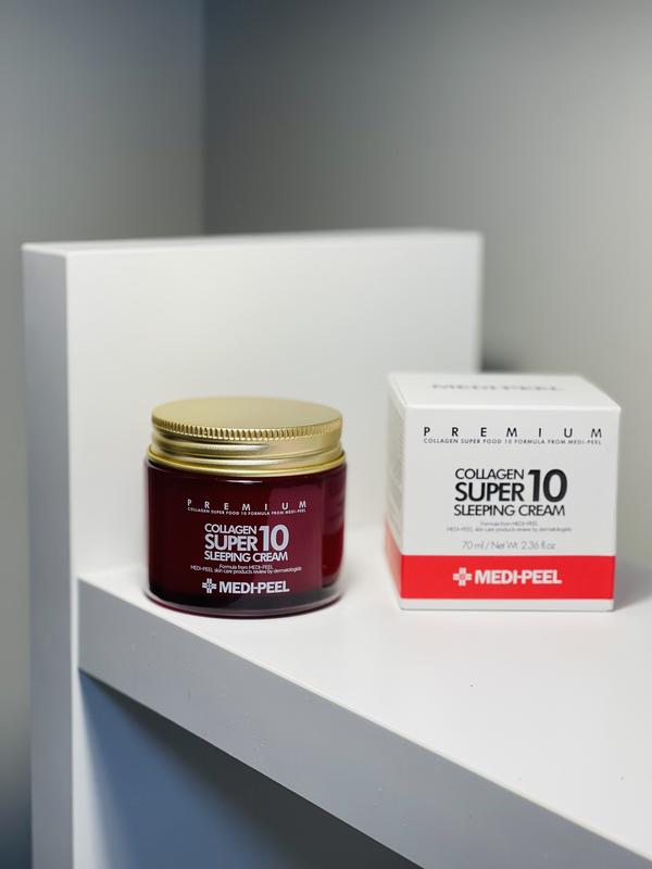Відновлюючий нічний крем для обличчя з колагеном MEDI-PEEL Collagen Super 10 Undeveloped Cream відновлює пружність і еластичність шкіри, зміцнює тургор, підтягує і формує овал обличчя. Крем відрізняється високою концентрацією колагену (10,000 ppm) який здатний заповнити шкірні заломи, зменшити глибину зморшок, а також стимулює вироблення власних еластинових і колагенових волокон. Комплекс екстрактів 10 суперфудов інтенсивно зволожує, підвищує імунітет шкіри, володіє високою антиоксидантною активністю та активно живить шкіру. Крем відновлює гідроліпідний бар'єр шкіри, попереджаючи старіння епідермісу, зменшує глибину зморшок і омолоджуючи. Незважаючи на глибоке живлення сам крем по текстурі досить легкий і невагомий. Чинить легку охолоджуючу дію і заспокоює шкіру. За ніч продукт інтенсивно живить і зволожує шкіру, проводить вологу на глибокі шари епідермісу і бореться з сухістю. Відновлює пружність і еластичність тканин, підвищує тургор і уповільнює процеси старіння. Основні діючі компоненти: Гідролізований колаген покращує загальний стан шкіри: розгладжує і вирівнює її, робить пружною і еластичною, прибирає дрібні зморшки і освіжає. Має ранозагоювальну і заспокійливою дією, утримує вологу в глибоких шарах шкіри. Пептидний комплекс збільшує пружність і еластичність шкіри, прискорює процеси вироблення організмом власних волокон колагену і еластину. Зменшує глибину зморшок і перешкоджає обвисання шкіри. Комплекс з 10 видів суперфудов є джерелом цілого комплексу макро - і мікроелементів. Делікатно відбілює пігментацію, знімає запалення, тонізує, заспокоює роздратовану шкіру. Має потужну антиоксидантну дію. Чудово зволожує шкіру, заспокоює, знімає запалення і почервоніння. Містить у своєму складі дубильні речовини, каротин, ліпіди, глікозиди, цукру, лимонна і яблучна кислоти за рахунок чого вирівнює структуру шкіри, має розгладжувальним ефектом, надає красиве природне внутрішнє сяйво. Сквалан зволожує шкіру, має антиоксидантні властивості (тобто уповільнює старіння) і захищає від негативного впливу навколишнього середовища, зокрема, брудного повітря. Гіалуронова кислота створює на шкірі невидимий бар'єр, що перешкоджає випаровуванню вологи, покращує структуру шкіри, сприяє регенерації клітин шкіри, усуває дрібні зморшки, робить шкіру гладкою і ніжною. Алое Вера сприяє пом'якшенню шкіри і зняття роздратувань, прискорює загоєння ранок, володіє протизапальною і антиалергічною активністю, надає антиоксидантну дію, стимулює синтез власних колагенових волокон. Ніацинамід сприяє стимуляції синтезу колагену і поліпшенню захисних функцій шкіри, допомагає знизити трансепідермальну втрату вологи з епідермісу і усунути пігментацію, зволожує шкіру, звужує пори, заспокоює, освітлює. Масло жожоба уникальный продукт, который очень благотворно влияет на состояние кожи. Масло оказывает регенерирующее, противовоспалительное, нормализующее действие, устраняет сухость и обезвоженность, глубоко питает кожу.