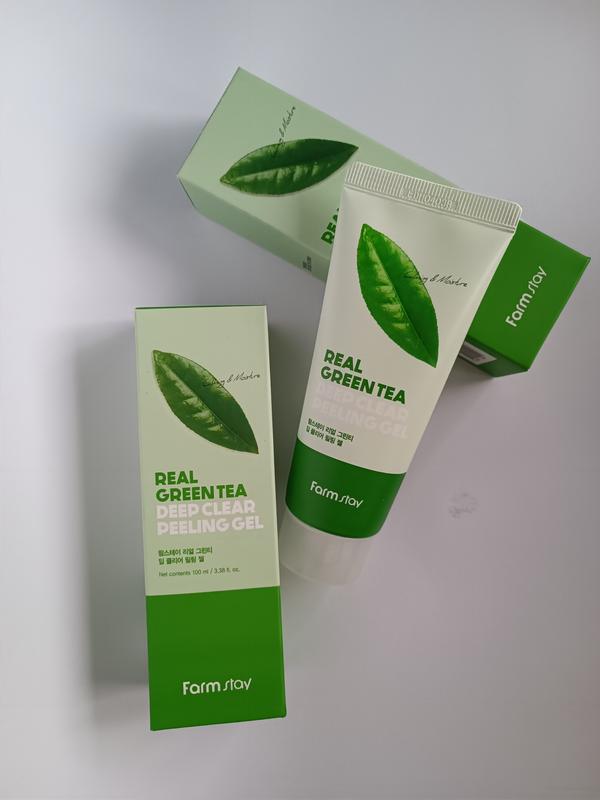 Пілінг-гель Farmstay Real Green tea Deep Clear Peeling Gel із зеленим чаєм м’яко очищає шкіру, прискорює злущування відмерлих клітин, перешкоджає появі закупорених пор, усуває тьмяний відтінок обличчя і робить шкіру свіжою і сяючою.