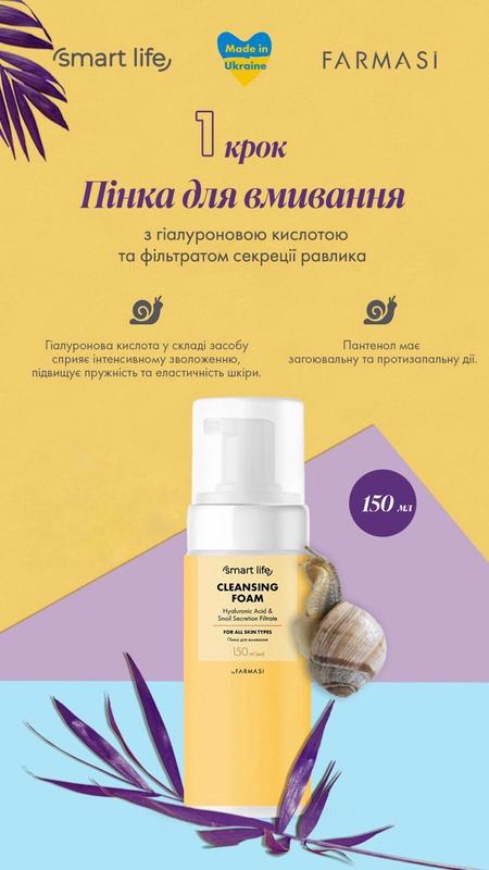 Пінка для вмивання з гіалуроновою кислотою та фільтратом секреції равлика Smart Life для всіх типів шкіри Ця пінка призначена для м'якого очищення від надлишків шкірного жиру, залишків косметичних засобів та інших забруднень. Гіалуронова кислота у складі засобу сприяє інтенсивному зволоженню, підвищує пружність та еластичність шкіри. Фільтрат секреції равлика стимулює регенерацію, зменшує подразнення та підтримує необхідний рівень гідратації шкіри. Пантенол має загоювальну та протизапальну дії. Інструкція із застосування: нанести пінку на вологе обличчя, ніжно помасажувати і змити водою. Використовувати для очищення обличчя від забруднень і макіяжу. 150 мл