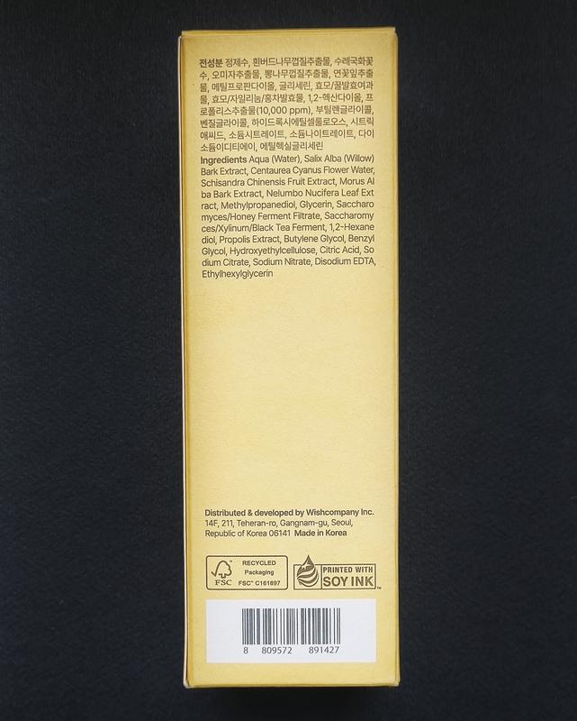 Aqua(Water), Salix Alba (Willow) Bark Extract (10%), Centaurea Cyanus Flower Water (9%), Schisandra Chinensis Fruit Extract (9%), Morus Alba Bark Extract (8.7%), Nelumbo Nucifera Leaf Extract (8.7%), Methylpropanediol, Glycerin, Saccharomyces/Honey Ferment Filtrate, Saccharomyces/Xylinum/Black Tea Ferment, 1,2-Hexanediol, Propolis Extract (1%), Butylene Glycol, Benzyl Glycol, Hydroxyethylcellulose, Citric Acid, Sodium Citrate, Disodium EDTA, Ethylhexylglycerin.