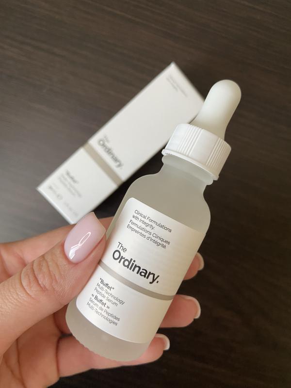 Buffet - Multi-Technology Peptide - сироватка призначена для усунення перших ознак старіння шкіри. Вона містить 11 амінокислот і комплекс гіалуронової кислоти, які мають позитивну дію на шкіру. Сироватка об'єднує кілька пептидних комплексів: