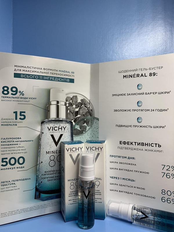 Чудовий щоденний гель-бустер Vichy концентрат mineral 89 активно протистоїть впливу експозому та зміцнює захисні функції шкіри. Його склад на 89% складається з термальної води Vichy з додаванням гіалуронової кислоти та високим ступенем мінералізації. Крім захисту, він забезпечує глибоке зволоження впродовж 24 годин і підвищує пружність шкіри. Найкращим чином бустер діє після очищення й тонізації шкіри та перед нанесенням основного засобу з догляду. Склад не містить парабенів, силікону, барвників, ароматизаторів і спирту.