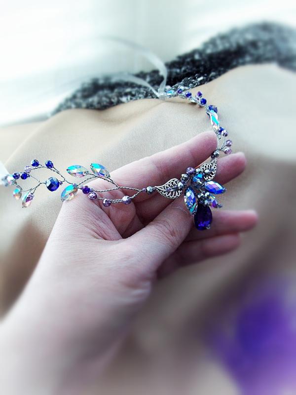 Авторська фентезійне прикраса для волосся "Ельфійська гілка" - це поєднання яскравих кольорових кристалів, що переплетені у вигляді рослини і великої центральної фіолетовою краплі . Вкраплення кришталевих намистин від фіолетового до сріблястого відтінку , центральні філігранні листочки під зістарене срібло і плетіння біжутерного дроту - всі елементи пов'язані між собою загальним задумом створити прикрасу для волосся в ельфійському стилі.