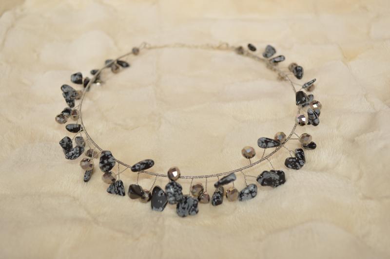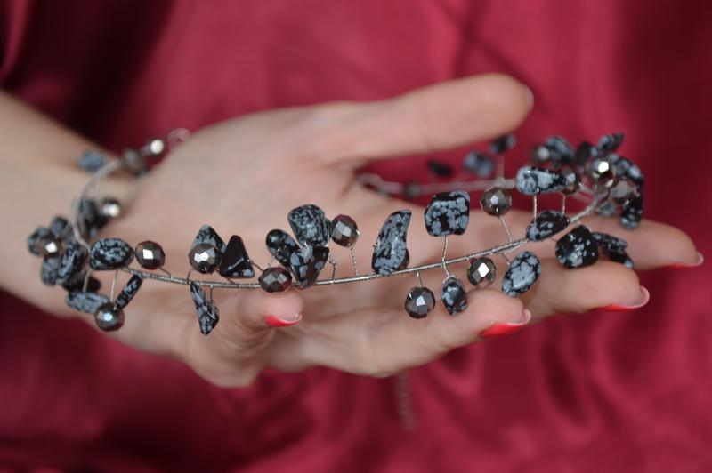 Эксклюзивное украшение для прически (ободок, венок) ручной работы из натурального неограненного снежного обсидиана и чешского стекла. На концах петельки, за которые ободок можно закрепить в прическе с помощью шпильки или заколки, а продев ленту, можно носить как венок. Могу добавить цепь с замочком для регулировки длины, которую при желании можно снять. Очень красиво и комфортно лежит на голове, не давит, не падает. Подойдет для выпускного бала, фотосессии, празднования Нового года и т.д. В моем магазине есть ободки из других натуральных камней в другой цветовой гамме. Литотерапевты предполагают, что этот минерал благотворно влияет на желудочно-кишечный тракт, способен излечивать простудные заболевания, возникшие из-за переохлаждения. По древним легендам, обсидиан предостерегает от дурных поступков и греха, охраняет своего владельца от сглаза и дурных людей, выводит отрицательные эмоции. Также этот камень помогает человеку стать более собранным, помогает концентрировать силы, оттачивает остроту мысли.