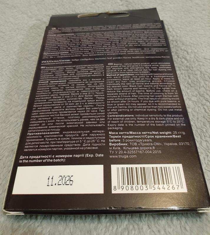Застосування: для фарбування волосся в темні тони змішайте хну з басмою і залийте гарячою водою (не нижче 80 ° С), перемішайте до однорідної консистенції, залиште не менше ніж на годину. Злегка охолоджену масу нанесіть на сухе чисте волосся і надягніть поліетиленову шапочку (пакет). Співвідношення хни і басми підберіть індивідуально в залежності від бажаного кольору.
